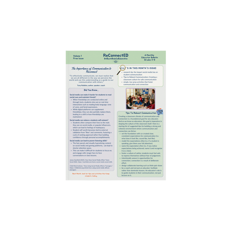 From icebreakers to in-depth discussion prompts, our ReConnectED Monthly Bulletin For Educators provides best practice tips, strategies and low-prep activities to boost communication skills, student connections and participation. Every issue is a gentle push toward deeper dialogue, braver voices, kinder listening and classes that hum with connection, leaving you saying, “And this is why I teach.”